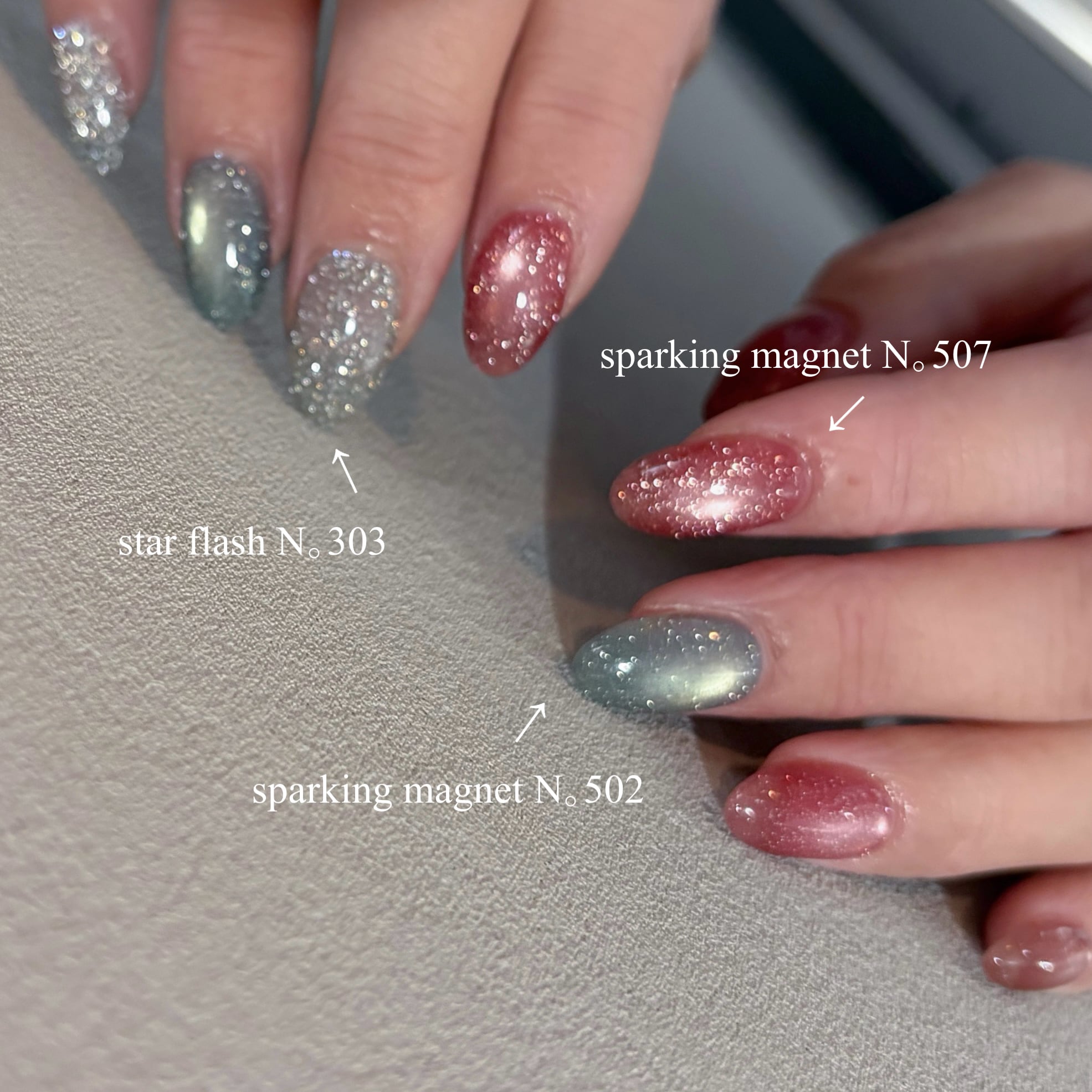 サラッと質感のくすみ系カラーのうるうるとろとろマグネットジェルに、スパクリングワインの泡のような繊細なシュワシュワな光のフラッシュが配合されたフラッシュマグネットジェルです。